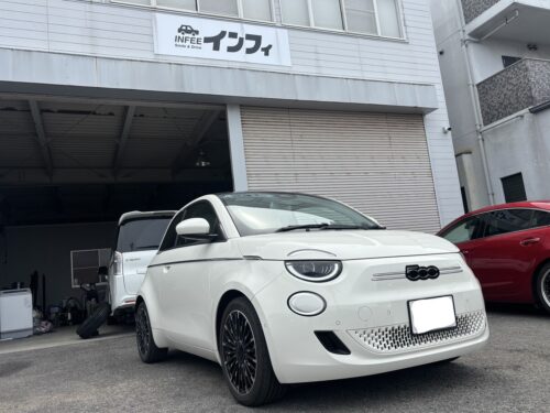 【フィアット 500e】タイヤローテーション&シーズンインチェック!松山市でFIATの修理はインフィへ!
